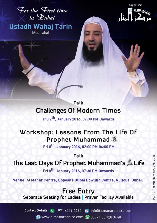 Challenges of Modern Times & Seerah January 6, 2016 When: 07/01/2016 and 08/01/2016 Where: Al Manar Centre, Al Quoz, Dubai Share this: Click to share on X (Opens in new window) X Click to share on Facebook (Opens in new window) Facebook Like Loading... Related